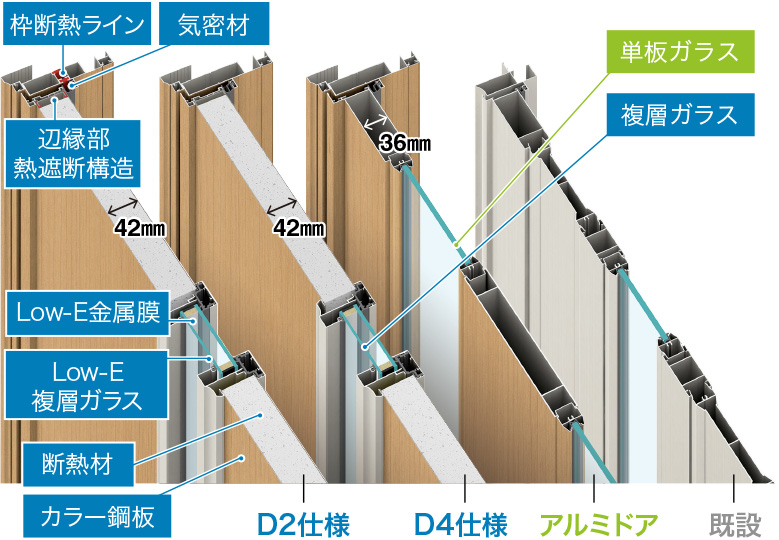 扉の間に断熱材を入れ、ガラスがペアガラスになっている断熱D4仕様や、ガラスがエコガラス(Low-E複層ガラス)になっている断熱D2仕様なら、玄関を断熱し、冬も暖かく過ごすことができます。