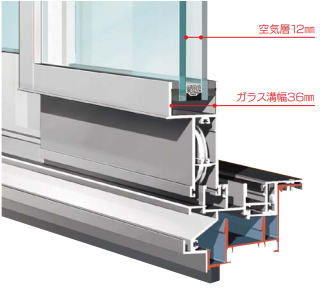 ガラス溝幅が最大36ミリに設定できるため、空気層12ミリの複層ガラスなどの断熱ガラスを入れることができます。一般複層ガラスの断熱性能は1枚ガラスの約2倍、エコガラス(Low-E複層ガラス)の断熱性能は1枚ガラスの約3倍。お部屋の暖かさ、冬の暖房費が変わります!